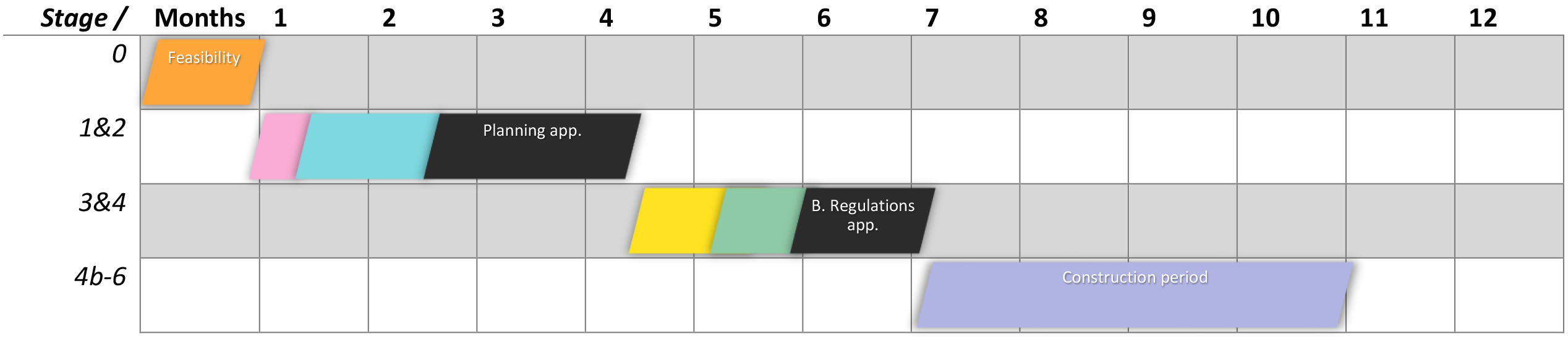 Timescale would be individual to each project and current workload. However, based on a typical house extension, an appropriate timeframe allowance from appointment to starting construction may be around 6 to 7 months. This timescale assumes a builder would be available once Building Regulations is achieved. In reality, a good builder may have between 6 months to a year lead-in time and therefore this would extend this timescale significantly.